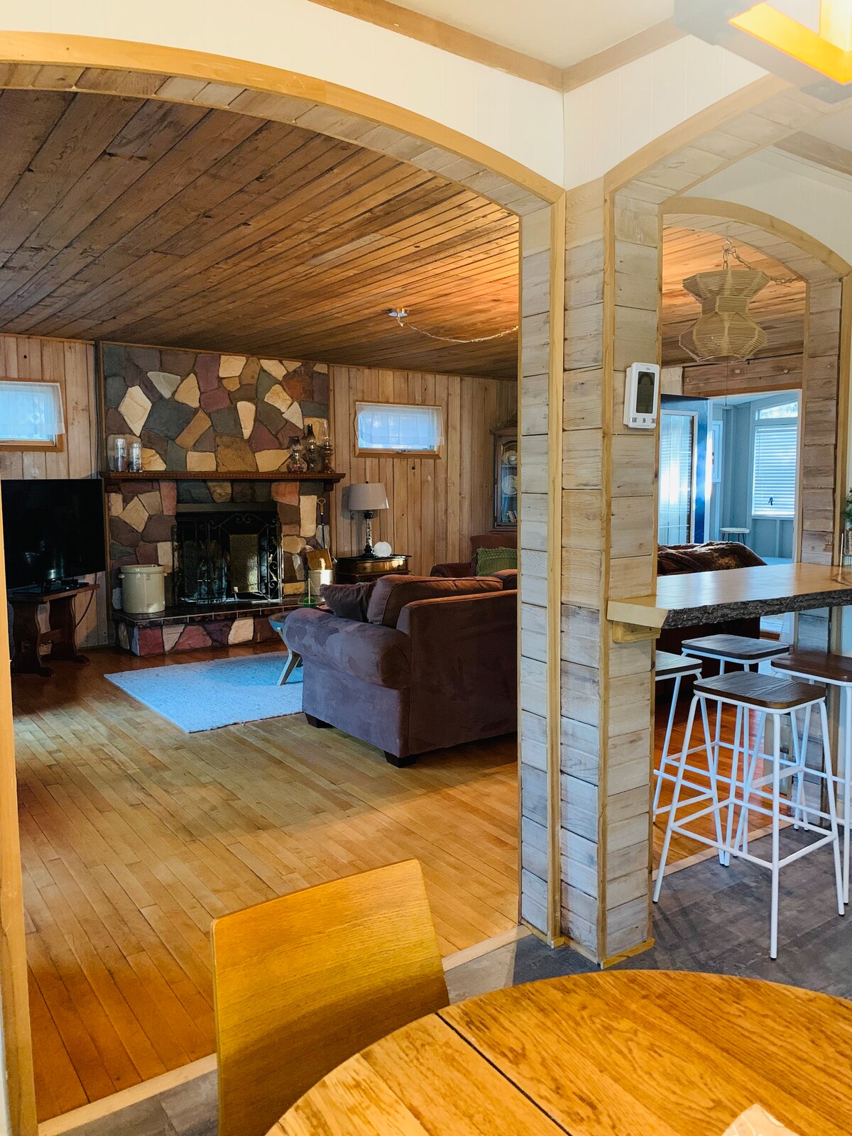 Booking for WINTER / SPRING/SUMMER/FALL 2026 Bring the whole family to this great fully renovated 4 season lakefront cabin. Enjoy snowmobiling, skating (you will need to shovel), snowshoeing, cross country skiing, ice fishing & winter walking. Summer swimming, beach, kayaking, lazy afternoons. 5 bedrooms, 8 queen beds, 2 full baths, washer/dryer. Open functional kitchen/island seating =4 . Inside dining table =10. Deck dining = 10+. ***LONG WEEKEND BOOKINGS ARE MINIMUM 3 NIGHTS***
