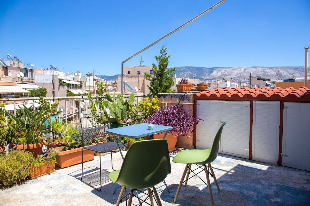A modern top floor Studio for 2 persons located in Koukaki urban area in central Athens. It is sunny and has a private terrace offering excellent views to the monument of Philopappou and to the mountain of Hymettus. It features high speed WiFi, A/C, fireplace, fully equipped kitchen, bathroom w/ shower and balconies. It's 5' minutes walk from Fix metro station, 10' from Acropolis metro and in walking distance from all major attractions as Acropolis museum, Theatre of Herodes Atticus, Plaka.