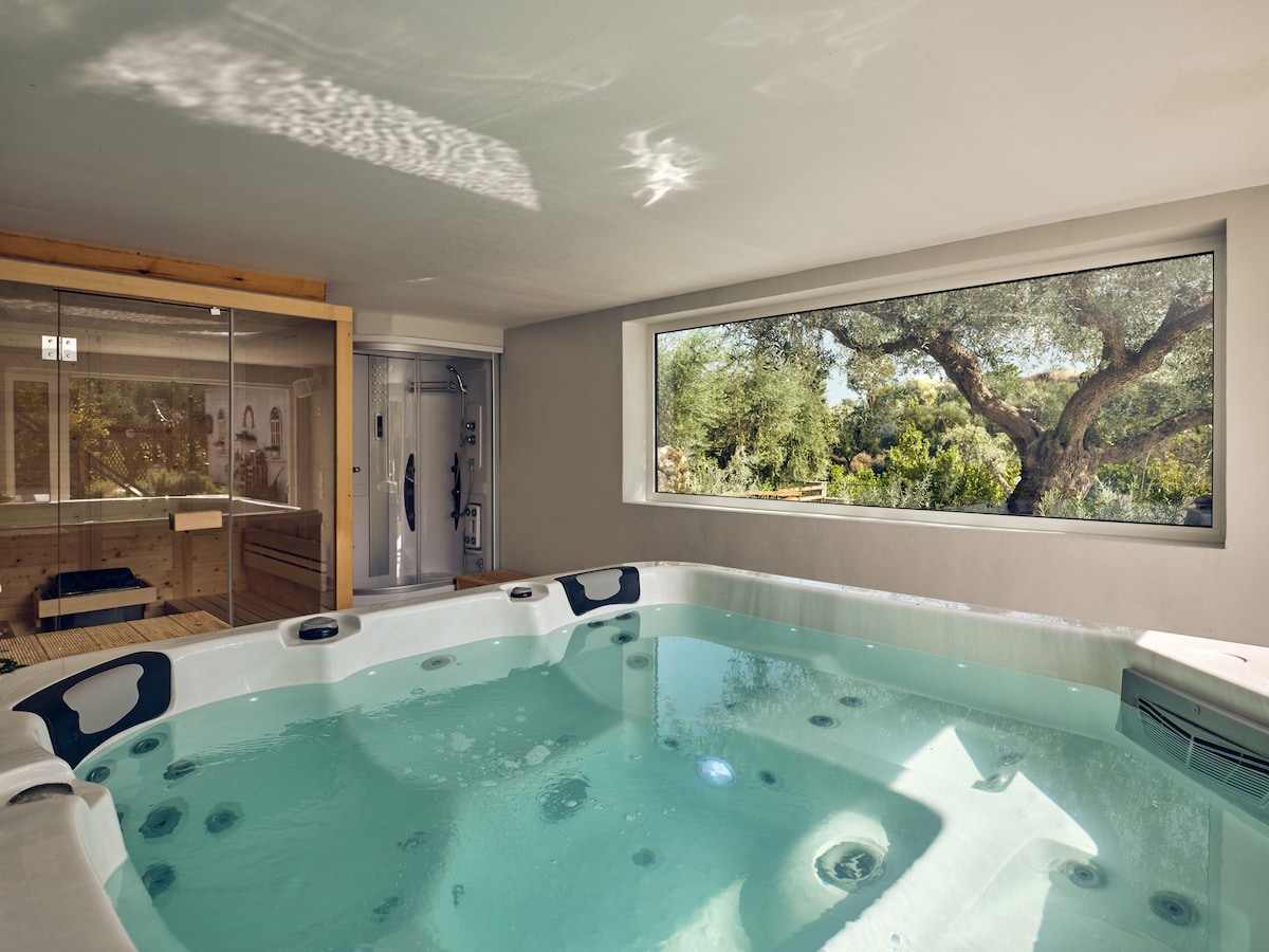 Isang kaakit - akit na maliit na taguan kung saan masisiyahan ka sa tanawin mula sa itaas ng mga puno ng oliba. Talagang naiiba at kapana - panabik na pagpipilian para sa mga bisita na nasisiyahan sa hitsura at pakiramdam ng natural na toned na kahoy , makalupang kulay at tanawin para muling mabuhay ang kaluluwa. Makaranas ng dalisay na kaligayahan sa nakamamanghang jacuzzi sa labas ng aming spa Napapalibutan ng tahimik na kalikasan, isawsaw ang iyong sarili sa pagrerelaks habang natutunaw ng mainit at bubbling na tubig ang tensyon at pabatain ang iyong diwa.