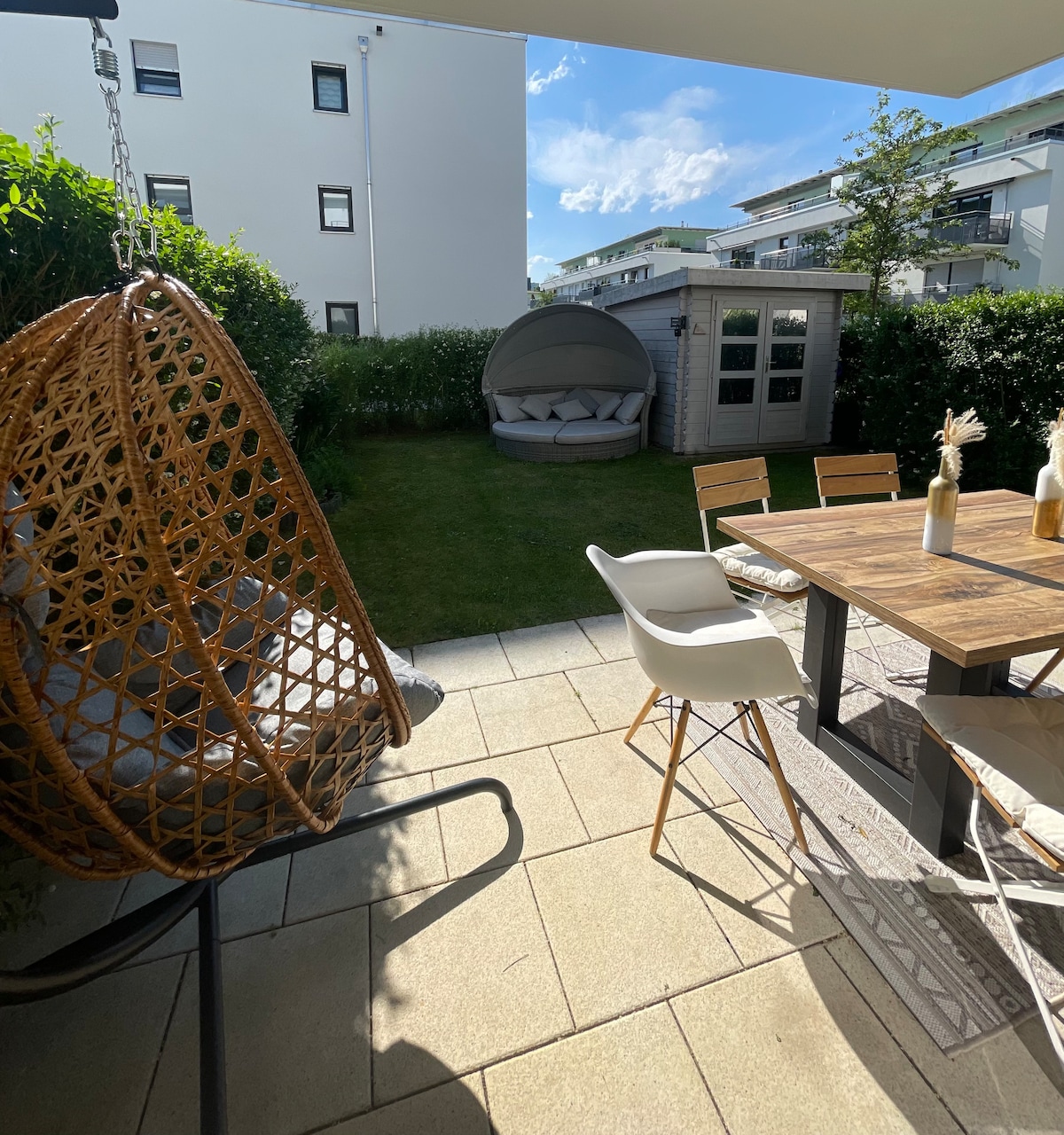 Nag - aalok kami ng aming maliwanag na apartment na 48 sqm para sa hanggang 4 na bisita sa Neubiberg/Munich. Kumpleto ang kagamitan nito sa kusina, may toilet bathroom, sala na may double bed na 180 x 200 at sofa bed na 150x200 para sa 2 pang tao. May access ang apartment sa malaking hardin na may komportableng upuan. Available ang paradahan. Sa pamamagitan ng pampublikong transportasyon, nasa sentro ka ng lungsod sa loob ng 25 minuto. Ang lahat ng mga tindahan ng pang - araw - araw na buhay ay nasa maigsing distansya.