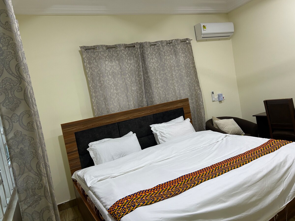 Isa itong komportableng apartment - May air-condition sa lahat ng kuwarto - Maayos at komportableng sofa na may dining set - Mga komportableng higaan sa kuwarto - Mga pader na may magagandang dekorasyon na bulaklak at litrato - Tuloy-tuloy na suplay ng tubig at kuryente na may stand-by na generator - Nasa magandang kapaligiran ito, ligtas na lokasyon na may mga naka‑install na camera, at may pader at gate.