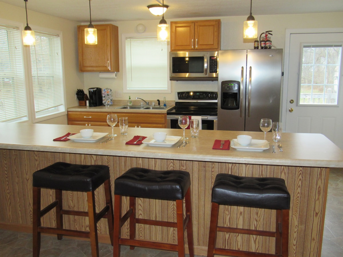 Ang Bella 's Suite ay ang pribado at mas mababang antas ng aming tuluyan, na may hiwalay na pasukan. Kasama sa magandang pinalamutian na tuluyan ang sala at silid - kainan, kusinang kumpleto sa kagamitan, paliguan, silid - tulugan, at massage room. Ang aming sakahan ay matatagpuan sa tabi ng 140 ektarya ng magagandang makisig na pampublikong daanan. Feed the cow, read a book on the beach, take a hike, fish for bluegills in our lake, race a pig, skip rocks or canoe in the creek, have a bonfire (S'mores provided) & stargaze from the relaxing hot tub!