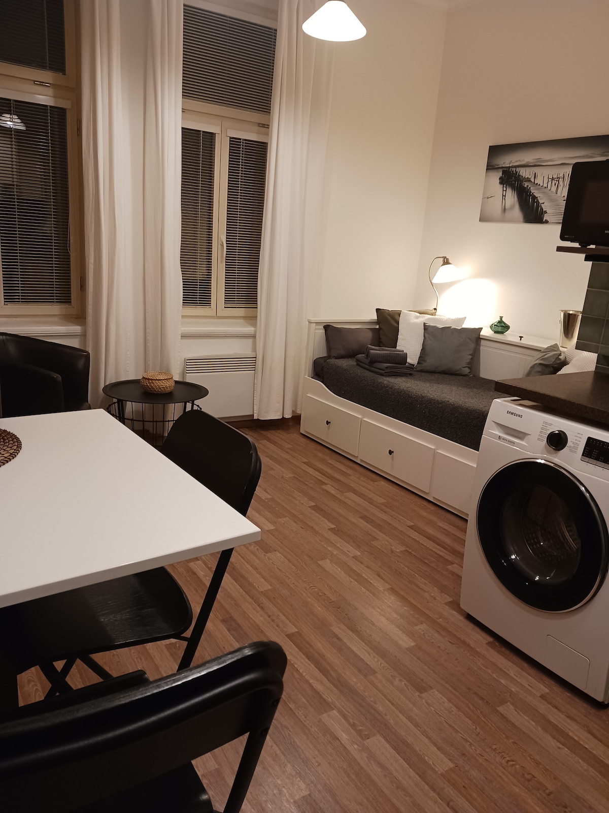Mag - almusal sa isang mesang maingat sa disenyo sa isang maaliwalas na kusina na may mga knotty na kahoy na sahig at minimalist na harina. Ang tuluyan na may 95sqm, matataas na bintana ay nagbaha ng masiglang sala sa natural na liwanag kung saan ang modernong sofa ay nag - aalok ng perpektong lugar para mamaluktot at magbasa ng magandang libro. Bukod dito, sa gabi maaari mong tangkilikin ang bawat piraso ng iyong pagtulog dahil ang lugar ay napakatahimik, sa kabila ng napaka - sentrong lokasyon nito. Umaasa ako na magugustuhan mo ang aking tuluyan tulad ng ginagawa ko at gagawin kong kasiya - siyang karanasan ang iyong pamamalagi.