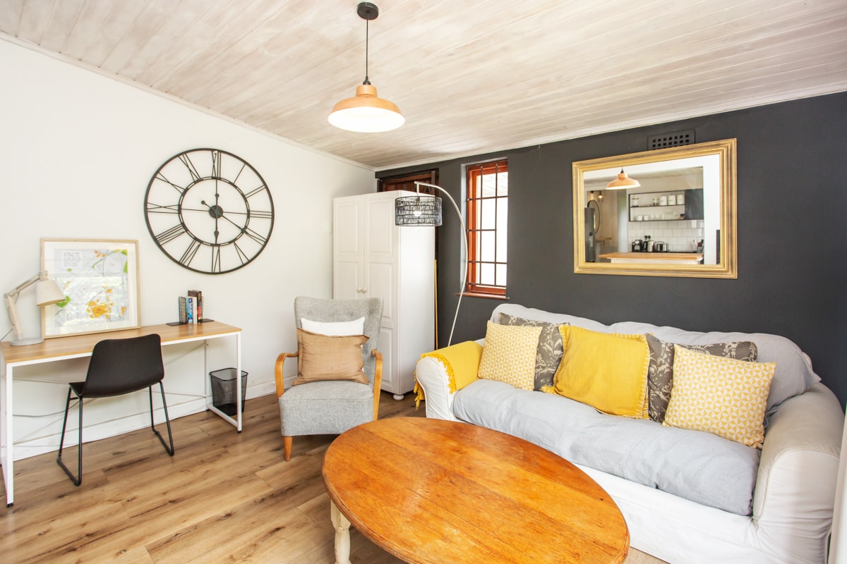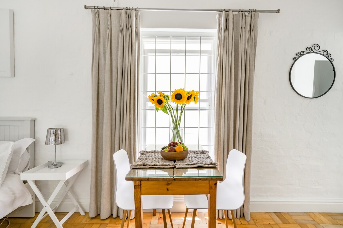 Maliwanag at maaraw. Matatagpuan sa gitna na may madaling access sa sentro ng lungsod, Kirstenbosch Gardens, Hout Bay at False Bay. Malapit sa UCT, mga paaralan, at mga shopping area. Hiwalay na apartment na may isang kuwarto sa unang palapag ng malaking property. Buong banyo en suite na may maliit na kusina na nilagyan ng microwave, induction plate at airfryer. May 2 armchair sa kuwarto at may munting mesang may 2 upuan para sa kainan o pagtatrabaho. Ang shared landing ay may 2 armchair at isang working counter at access sa shared deck