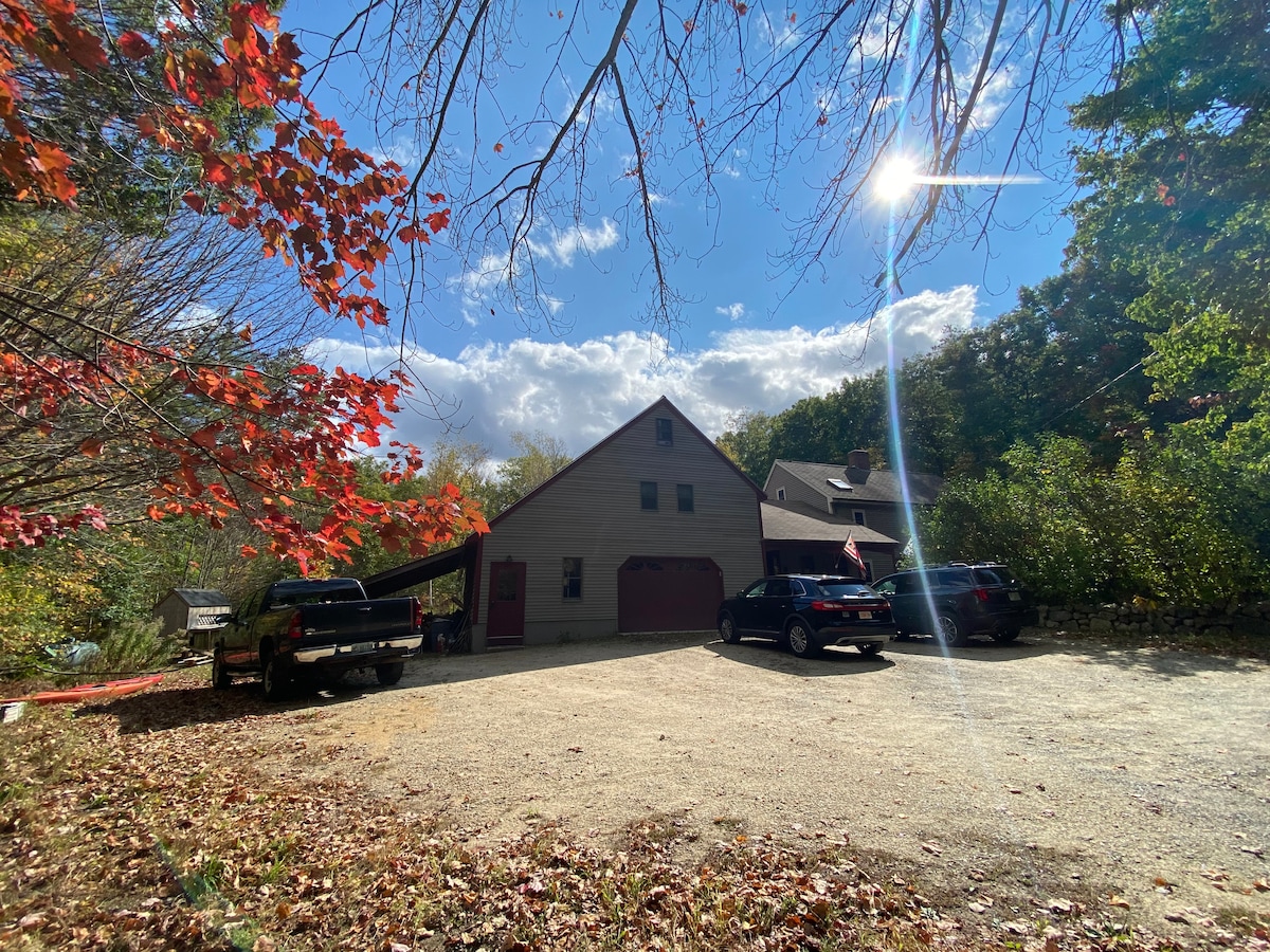 Ganap na inayos na studio apartment sa itaas ng garahe ng mga may - ari ng bahay na may pribadong pasukan. Liblib na 5.5 ektaryang lupain na napapalibutan ng magagandang kakahuyan. May mga vault na kisame na may hagdan papunta sa loft na may queen bed. Malalaki at maaraw na bintana na nakaharap sa timog kung saan matatanaw ang bakuran at mga hardin. Ang mga may - ari ng tuluyan ay isang mag - asawang bakla na nakatira sa pangunahing bahay kasama ang kanilang 5 taong gulang na anak na babae. LGBTQ friendly na tuluyan na tumatanggap ng uri ng mga bisita ng anumang lahi, relihiyon, kasarian, at oryentasyon. Isang minuto mula sa Route 125.