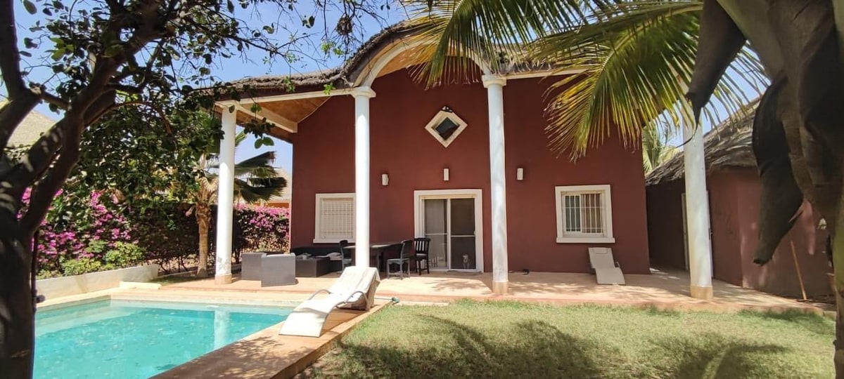 "White House " Villa Individuelle de Standing. Mga paa sa tubig. Inayos, na matatagpuan sa Warang/Nianing sa maliit na baybayin ng Senegalese, sa isang kapitbahayan sa Europe. Maganda ang makahoy na hardin na 2500 m2, malaking swimming pool, pribadong beach, 4 na silid - tulugan na may kanilang banyo at palikuran. Malapit sa mga tindahan ng nayon ng Warang. Mga tauhan ng tuluyan (housekeeper, tagapag - alaga ng araw at gabi, dagdag na tagapagluto).