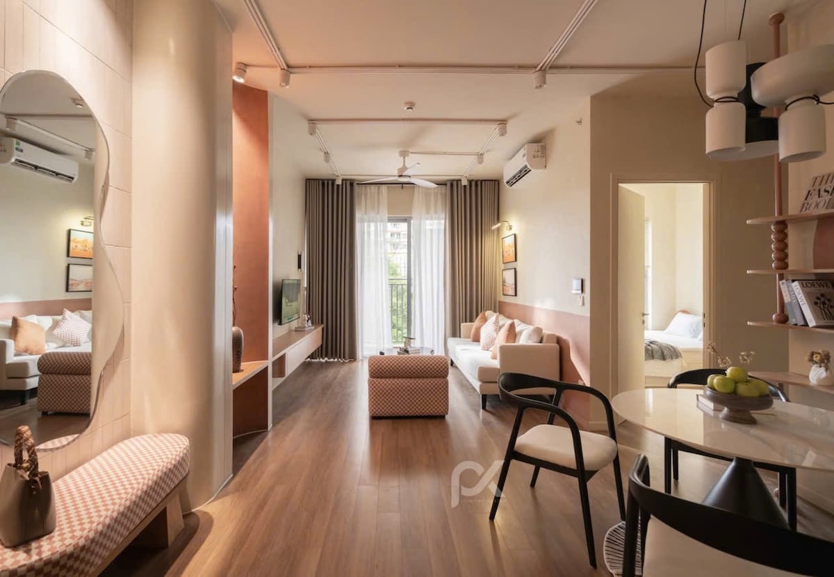 A stylish & comfortable apartment 85m2 at Hung Phuc Happy Residence Premier located in the heart of district 7, Phu My Hung, with just a short walk to all the best shops, restaurants, and conveniences. Nearest bus stop in front. Highly educated and quite neighbors that surrounded by green parks and beautiful villas. Decorated in modern Japandi x Wabi sabi style with a focus on natural materials & clean lines. A great getaway or even staycation for those who want to experience new things.