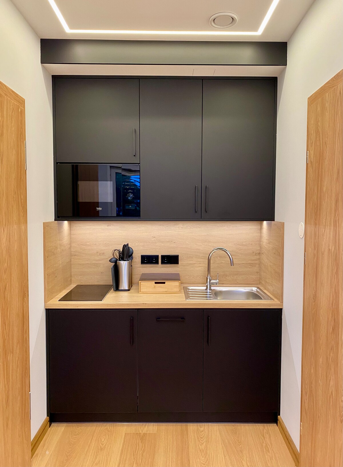 Ang lugar na ito ay isang komportableng studio. Nakakatulong sa trabaho at pahinga ang kusinang kumpleto sa gamit, komportableng higaan, at praktikal na tuluyan. Nakakahawa ang magiliw na interior, mga kulay, at mga detalye kaya siguradong babalik ka.
