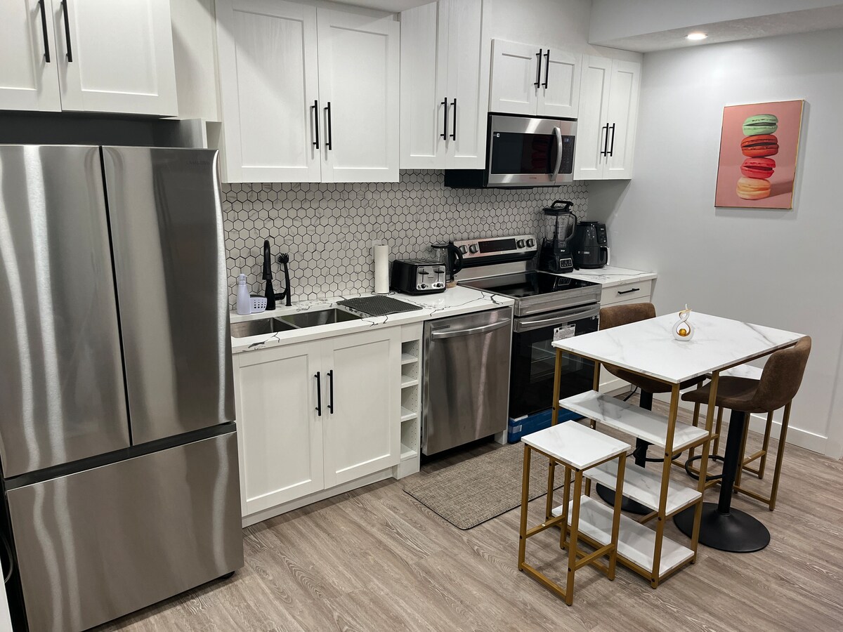 Magpakasawa sa isang matamis na pagkain! Nagtatampok ang maganda, maliwanag, at pribadong guesthouse na ito ng tema ng disenyo na inspirasyon ng masiglang komunidad sa paligid nito - Maligayang Pagdating sa Orchard House sa SW Edmonton. Magugustuhan mo ang masaganang higaan, kape sa umaga gamit ang sarili mong Keurig machine, mga pinag - isipang detalye tulad ng mga wireless charging pad, at pagrerelaks gamit ang komplimentaryong Netflix. Malapit sa YEG International Airport, Amazon warehouse, South Edmonton Common, at marami pang iba. Mainam para sa aso na may parke ng aso sa loob ng maigsing distansya.