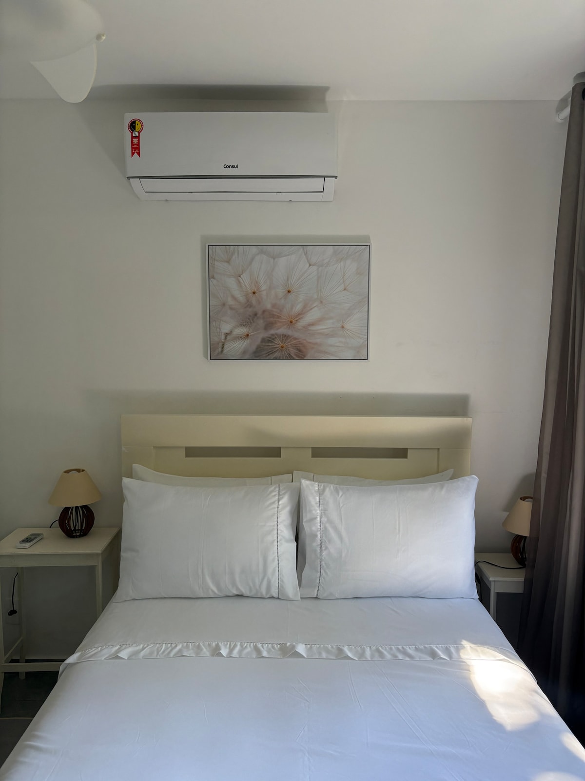 Lokal na tahimik, moderno, elegante. Kumpletong kagamitan at gumagana para sa dalawang tao. Pribilehiyo ang lokasyon sa kapitbahayan ng Ingá sa Niterói, na may mga pamilihan, parmasya, hortifruti, cafe, restawran at gym. 350 metro ang layo nito mula sa tabing - dagat at malapit ito sa Mac at Uff. Cooktop, refrigerator, microwave, coffee maker, sandwich maker at iba pang kagamitan sa bahay. Mga air conditioning, TV, bed and bath linen, de - kuryenteng shower, hairdryer at bakal. Ampla counter para sa trabaho o pag - aaral.