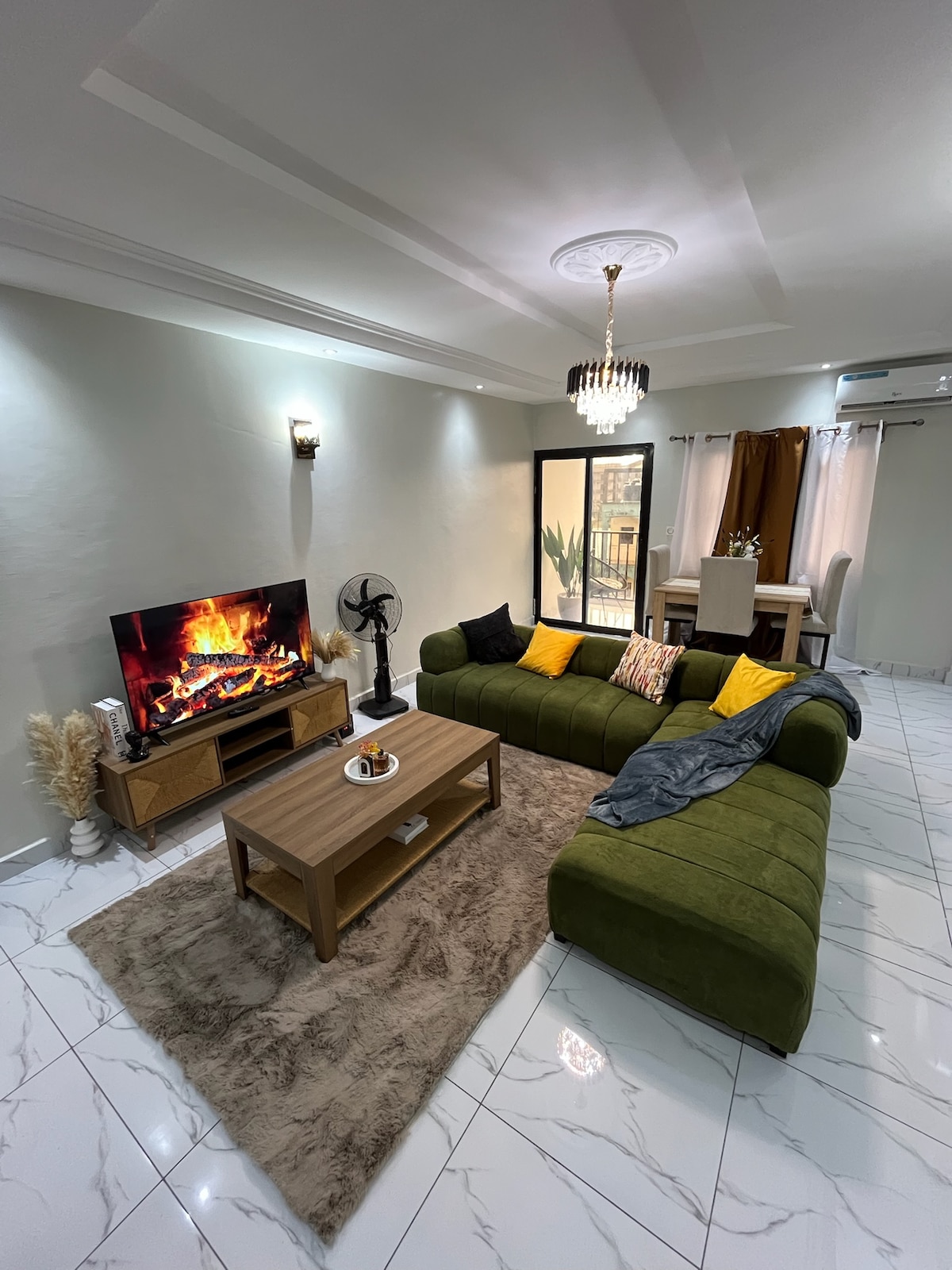 Magrelaks kasama ng buong pamilya sa mapayapang apartment na ito. Makakakuha ka ng libreng WiFi, mga AC sa lahat ng silid - tulugan at sala, smart TV na may canal+, malaking kusina, dalawang balkonahe, libreng generator para sa mga kagamitan na may mababang pagkonsumo lamang (hindi sinusuportahan ang mga AC), magandang tanawin sa lungsod, tagapag - alaga sa gabi, tore ng tubig para matiyak na hindi kailanman tuyo ang gripo, isang napaka - modernong supermarket sa 5 minutong lakad. Ikaw ang magbabayad ng kuryente. Available ang mga serbisyo sa paglilinis kung kinakailangan at sinisingil. Mga serbisyo sa paglalaba din. Maligayang pagdating
