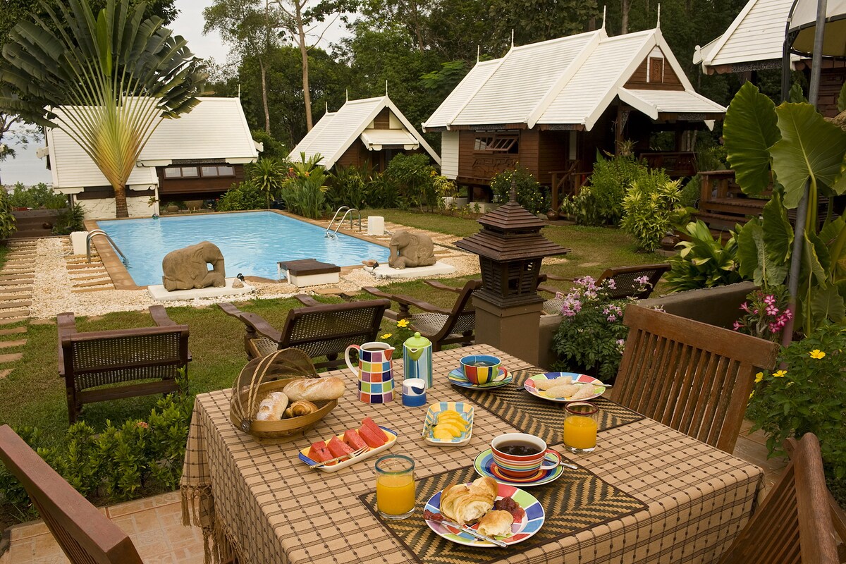 Masiyahan sa isang pribadong lugar na nalunod sa halaman, halos sa tubig, na nakaharap sa kahanga - hangang baybayin ng Phangna. Ang kuwartong ito para sa 1 tao ay may air conditioner, balkonahe at sariling banyo (kasama ang almusal). Puwedeng tumanggap ng 23 tao ang 9 na bungalow ng property. Ang perpektong lugar para sa isang workshop, isang kakaibang seminar, isang reunion ng pamilya, isang kaganapan upang ipagdiwang. Para sa higit pang silid - tulugan o para i - privatize ang lugar, makipag - ugnayan sa akin.