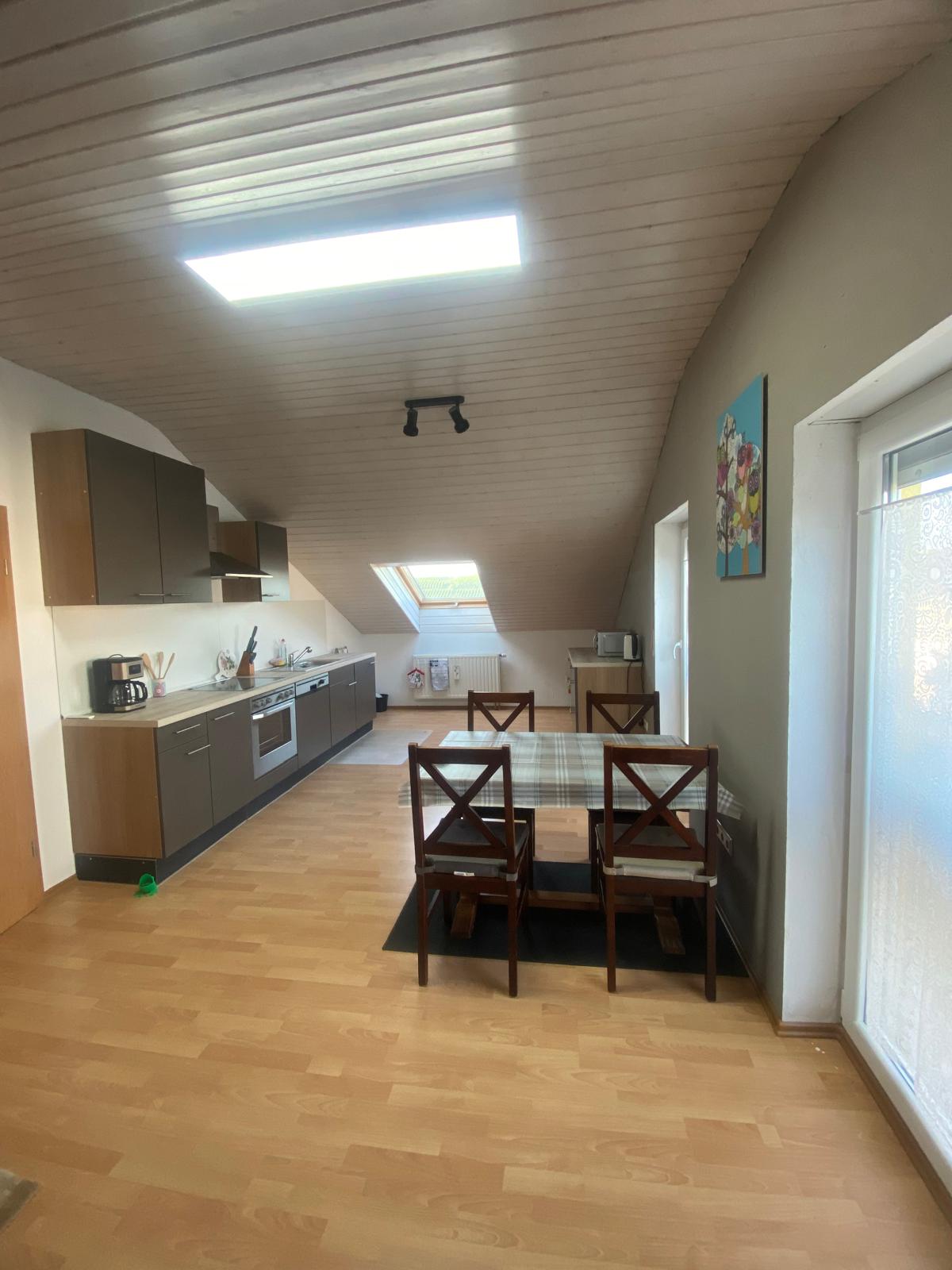 Entspann dich in dieser besonderen und ruhigen Unterkunft. Die DG-Wohnung im 2.OG bietet 2 Schlafzimmer 1 Wohn & Esszimmer, Küche und Bad. Das Haus ist ein Neubau und entsprechend ist die Innenausstattung in hellen und freundlichen Farben. Die Wohnung ist in einer ruhigen Lage und hat einen schönen Blick ins Grüne, auf dem es sich prima vom Alltag erholen lässt. Ausstattung: Fußbodenheizung, komplette EBK inkl. Geschirr usw. begehbare Dusche, bodentiefe Fenster im Wohn-Küche u.Essbereich.