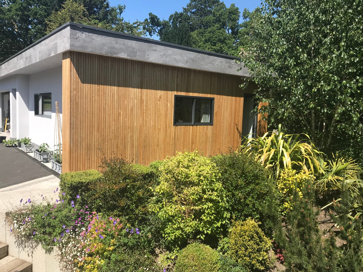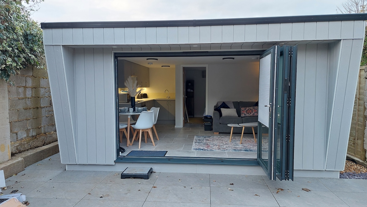 Medyo bakasyon, na may lahat ng kailangan para sa maikling pamamalagi. Naka - istilong moderno, stand alone studio, na may pribadong pasukan. Modernong shower room at maliit na kusina, na may dining space at King size bed. May shared garden area na may sariling dining at lounging area. Mayroon kaming isang kaibig - ibig na maliit na aso na napaka - friendly at din ang paminsan - minsang pagbisita sa magiliw na mga aso ng pamilya, na maaaring nasa paligid sa hardin upang bumati.