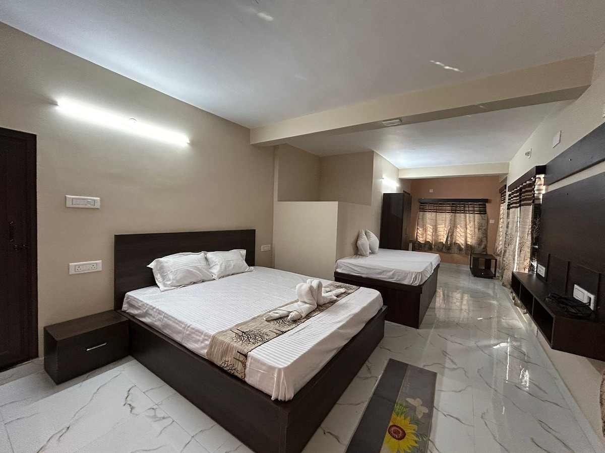Tuklasin ang kamangha - manghang apartment na 4BHK na may kumpletong kagamitan na ito, isang maikling lakad lang mula sa Kolkata Airport. Nagtatampok ang pambihirang tirahan na ito ng pribadong terrace at balkonahe, na perpekto para sa pagrerelaks o paglilibang. Sa pamamagitan ng air conditioning, at ang kusinang may kumpletong kagamitan ay nagsisiguro ng kaginhawaan, na ginagawa itong perpektong timpla ng luho at pagiging praktikal para sa iyong perpektong bakasyon! Ang magandang bukas na terrace, ay ang perpektong lugar para sa umaga ng kape, meryenda sa gabi, o simpleng pagrerelaks na may malawak na tanawin ng lungsod.