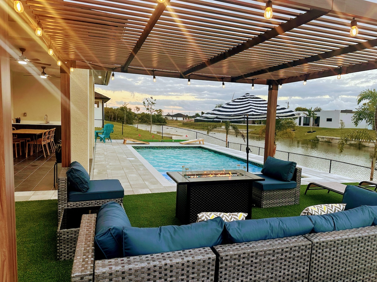 I - book ang aming pinapanatili at pinainit na tuluyan sa pool na may mga kisame sa magandang SE Cape Coral! 10 minutong biyahe lang sa downtown at Sun Splash waterpark at ilang minuto sa mga tindahan, restawran, at eco preserve. Wala pang 35 minuto hanggang Ft. Myers beach at Sanibel. Ang mararangyang bagong muwebles, fire pit table, luntiang bakuran, at ang naayos na pinainit na pool na may vase fountain ay nagbibigay ng isang kahanga-hangang karanasan! KASAMA NANG LIBRE ✔️ Mabilis na WiFi ✔️ Kape at Tsaa ✔️ Lahat ng kagamitan sa kusina Mga ✔️ Beach Towel at marami pang iba