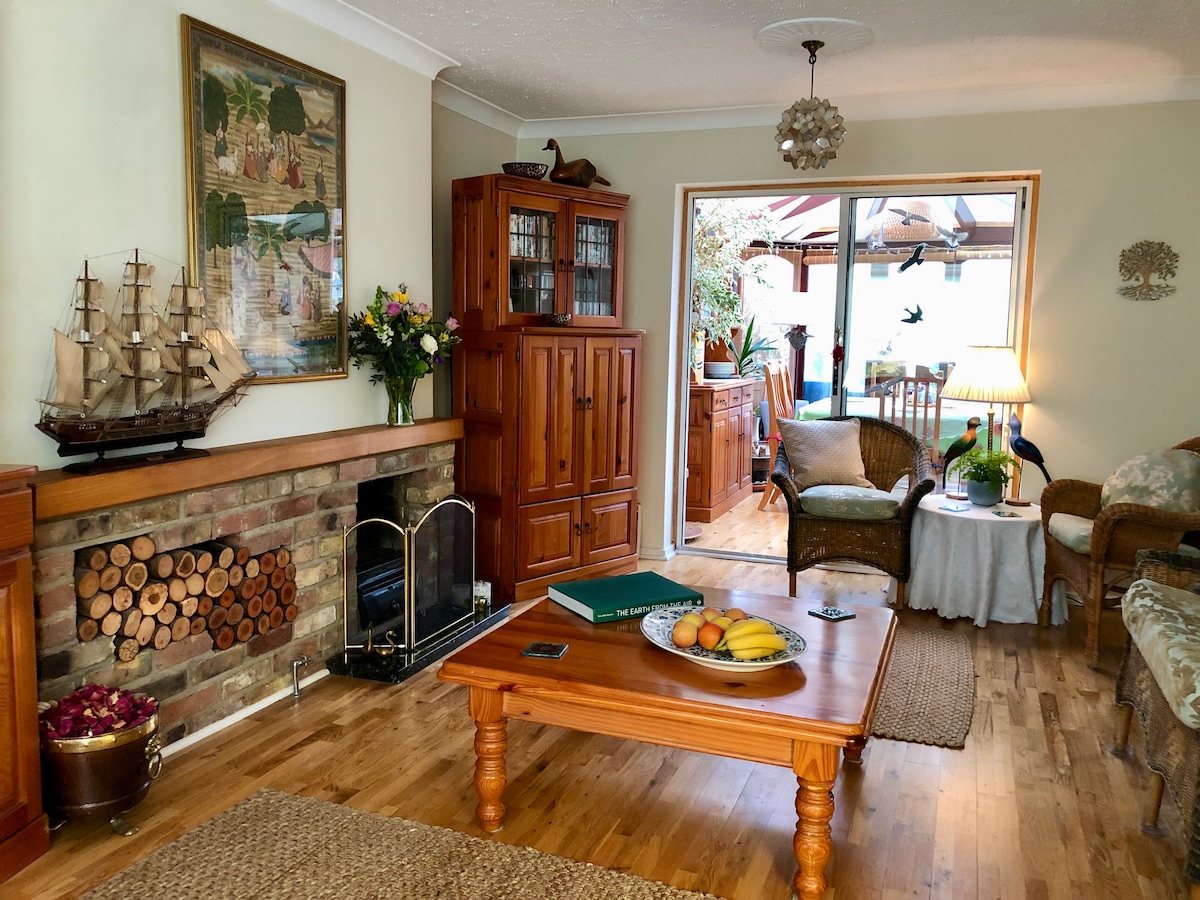 Maligayang pagdating sa iyong tuluyan mula sa bahay sa "Garden City" ng Welwyn. Magrelaks at magpahinga sa komportableng tuluyan na ito noong 1950. Mayroon kaming magandang twin room na may shared bathroom. Available ang almusal kapag hiniling at nilalayon naming pasayahin ang mga rekisito ng aming bisita. May magandang maliit na patyo sa hardin na puwedeng pagparadahan at dalawang parking bay na may dagdag na libreng off - street na paradahan. Pampublikong transportasyon papunta sa istasyon ng tren at Mga Link ng Bus sa Heathrow sa aming pintuan.