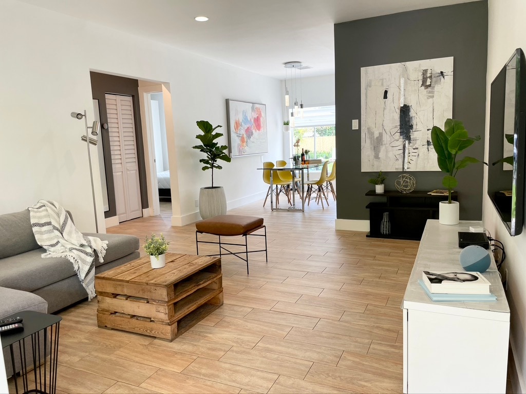 Located by the Miami Design District and curated to complement. This is a fully licensed and professionally managed, hotel-style property that puts cleanliness first. This property includes 2 villas in one building. Each villa has 2 BR & 1 BA, and a private entrance. You are renting the entire property 4Bedrooms & 2Bath + backyard - 1 min. Design District - 5 min. Wynwood - 9 min. Brickell - 10 min. Miami Cruise port - 11 min. MIA airport - 14 min. to South Beach (Miami Traffic varies by time)