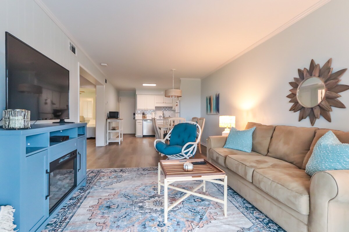 Ang 'A Happy Place' ay perpektong naglalarawan sa perpektong itinalagang 2Br na ito (King, Twin (mga higaan...o pinagsamang King), 2 full bath "villa" sa Tupelo Bay (milya mula sa beach ng pamilya). Pribadong balkonahe w/ tanawin ng pond/fountain/golf center. WiFi, internet, cable, flat screen. Kumpletong kusina w/ dining bar; bukas na living area (w/ dining table). Paghiwalayin ang labahan na may washer/dryer. Mga amenidad: mga kagamitan sa beach, club house, indoor at outdoor pool, gym. Beach Shuttle sa tag - init. Serbisyo ng elevator sa gusali sa lahat ng palapag.
