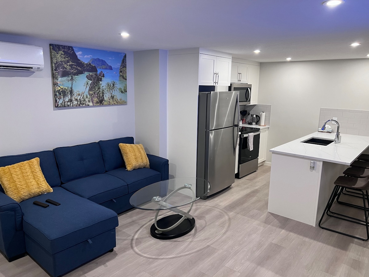 Isang tahimik na yunit na may kaaya - ayang kagamitan para sa iyong tirahan. Tuklasin ang walk - out unit na may natural na ilaw at tingnan ang berdeng espasyo para sa iyong tahimik na pagmumuni - muni. May Skating rink sa tabi ng iba pang pangunahing grocery/shopping outlet na malapit sa unit. Ang aming property ay ang perpektong pagpipilian kung naghahanap ka ng isang one - bedroom walk - out basement unit na pinagsasama ang kaginhawaan, kaginhawaan, at isang pangunahing lokasyon. Nasasabik na kaming i - host ka sa panahon ng iyong pamamalagi.