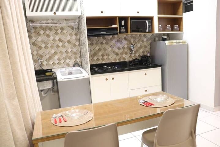 Sopistikadong Studio, komportable, iniangkop na dekorasyon at balkonahe sa45m². Lahat ng item para sa iyong pamamalagi. Split Air Conditioning, Smart TV, Wifi, Dishwasher, Lava at Dry, Cellar, Microwave. 24 na oras na pagtanggap, paglalaba, at saklaw na espasyo. Sa labas ng gusali ng panaderya para sa almusal, parmasya, bistro, gym. Market na malapit sa 200m at iba pang opsyon sa gastronomy. Ang Noroeste ay isang high - end na kapitbahayan sa Brasilia. 6 km ang layo ng lungsod mula sa Kongreso. 23 km mula sa Paliparan.