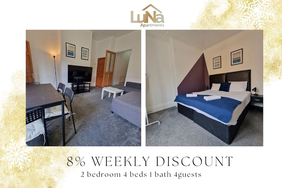 2 bed 1st floor apartment, puwedeng matulog nang hanggang 5 bisita Kung hindi available ang apartment na ito, mag - click sa aming profile para makita ang iba pang apartment sa parehong bloke. Kumpletong kusina at mga bagong kasangkapan sa iba 't ibang panig ng mundo. Matatagpuan sa loob ng 10 minutong lakad papunta sa sentro ng lungsod/quayside kung saan maraming nightlife, kainan, sining at kultura, o naka - istilong Jesmond kasama ang mga wine bar at cafe nito. Mahusay na mga link sa transportasyon papunta sa baybayin. Mainam ang aming mga matutuluyan para sa mga pamilya, turista, at kontratista.