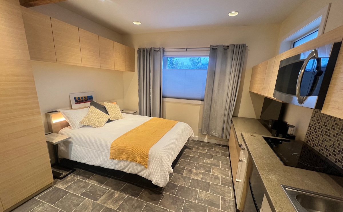 This stylish and newly built studio suite is located in a quiet and established area of Porter Creek. This suite features a cozy living area, a spacious and fully equipped kitchen, and a comfortable queen-sized bed. It’s adorned with custom-fit blinds, undermount cabinet soft lighting and a beautiful (and easy to operate) electric fireplace. In our suite you will find a full-sized fridge, washer, and dryer, and unlimited high-speed internet along with Netflix for your viewing enjoyment.