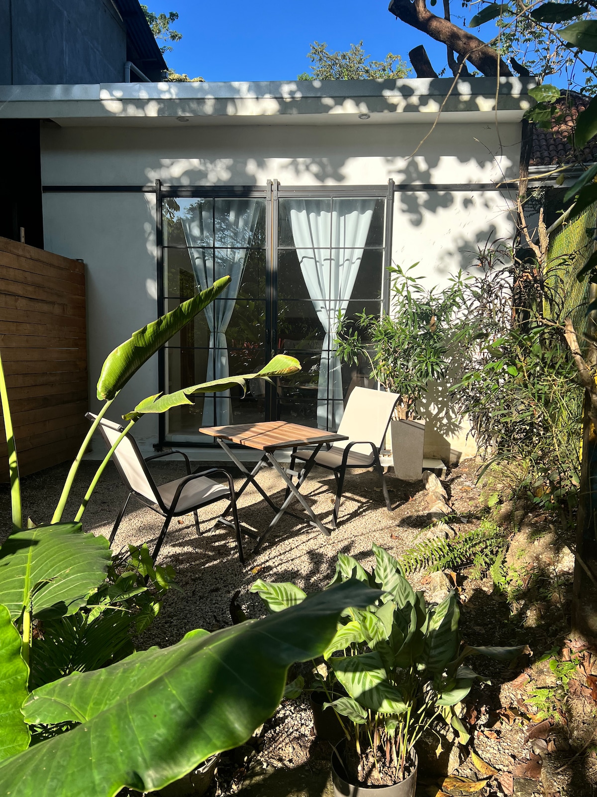 Thoughtfully designed, this elevated and high ceiling house offer all the comfort and convenience needed for both short and extended stays. - Loft bedroom with queen-size bed - Living room, sofa bed (medium) - Spacious and sunlit - Desk - Bathroom w/ rain shower - AC, ceiling fans - 100mb Wi-Fi - Safe box - Fully equipped kitchen (stove, fridge, microwave, coffee maker, more. - Covered terrace - Large sliding glass doors (w/ screens) - Laundry - Pool - Outdoor shower - Private & secure parking