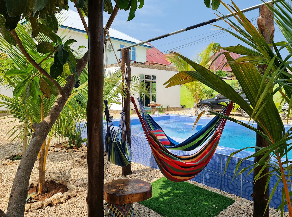 Guesthouse na may pribadong banyo, kusina at lugar na nakaupo sa labas. Malaking hardin at pinaghahatiang swimming pool (kasama lang ako at ang aking pamilya). Available at kasama ang wifi (20 Mb/s). Nililinis ang kuwarto isang beses kada linggo para sa mas matatagal na pamamalagi. At may libreng magagamit na washing machine kung kinakailangan. 20 -25 minuto ang layo mula sa Nungwi o Kendwa beach, o 5 minuto gamit ang kotse o tuktuk. Tinutulungan ka naming ayusin ang transportasyon kung kinakailangan 😊