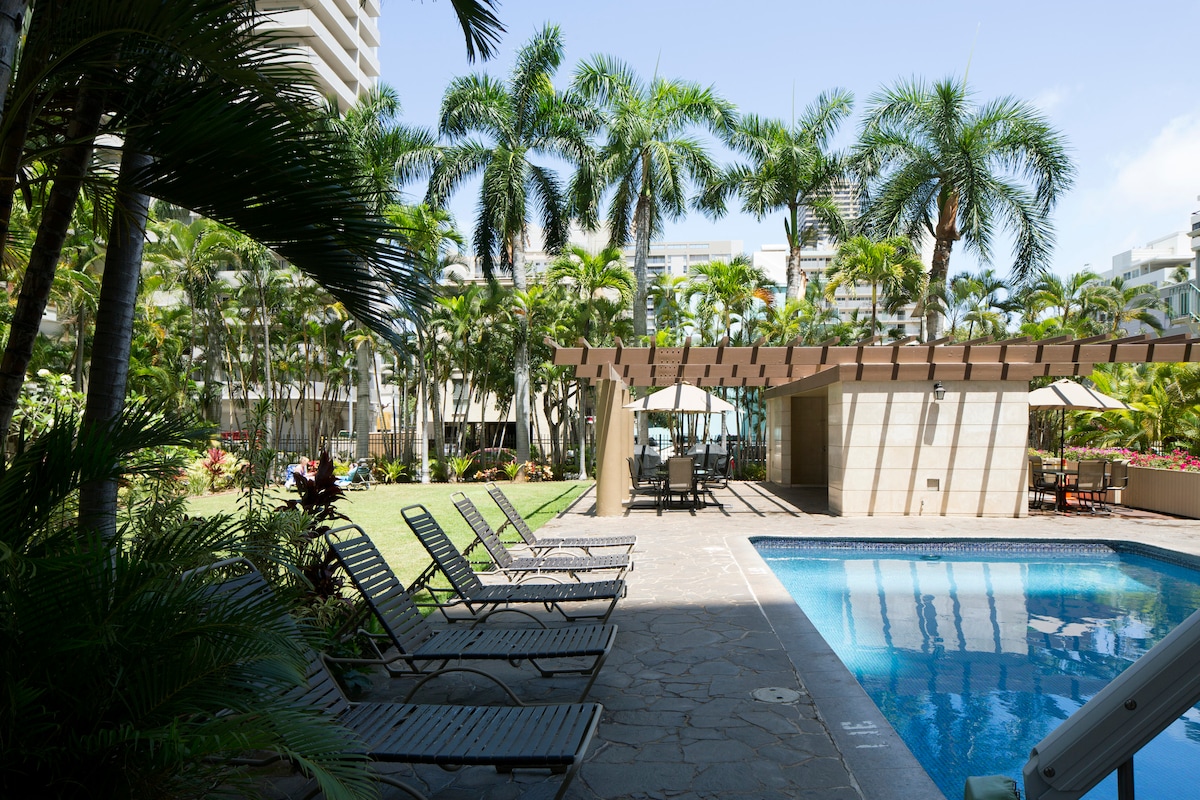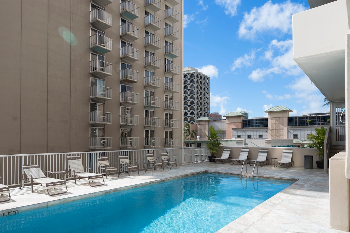 Maligayang pagdating sa iyong perpektong bakasyunan sa isla para sa 'Ohana! Ang malinis at komportableng studio retreat na ito ay nasa ika -18 fl. ng isang gusaling may estilo ng resort. Isang bloke lang mula sa beach at ilang hakbang ang layo mula sa mga sikat na lokal na restawran, tindahan, at cafe. Kasama sa aming kanlungan ang: queen - sized bed+queen sofa sleeper, kumpletong kagamitan sa kusina, high - speed Wifi, TV, mga pampamilyang laro at beach gear na kasama para sa iyong mga paglalakbay! Halika at magpahinga para tuklasin ang isla sa aming tuluyan nang may kaginhawaan ng isang pangunahing lokasyon!