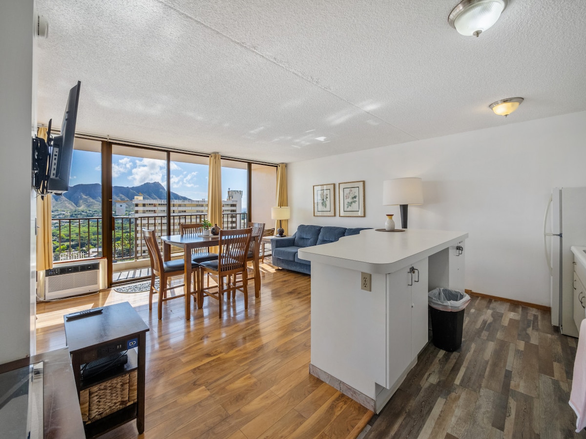 Ganap na inayos sa modernong estilo ng pagreretiro, na may mga nakamamanghang tanawin ng karagatan, Diamondhead at mga bundok. Kanais - nais na lokasyon - sa Waikiki - ilang minutong maigsing distansya papunta sa Convention Center, beach, shopping, kainan, entertainment... Nakatulog ang dalawa sa full size na kama. May maliit na kusina, na angkop para sa mahaba at maikling pamamalagi. Condohotel na may 24/7 na seguridad, pool, jacuzzi, BBQ, labahan, tindahan, bar, ATM.... Available ang paradahan at fitness, ngunit dapat bayaran nang hiwalay. SA -029 -819 -2896 -01