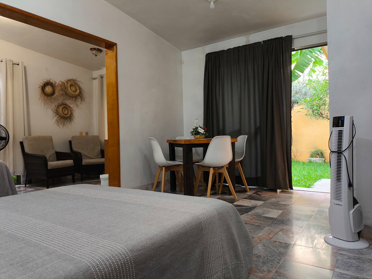 Espaciosa suite en el jardín de una casa en zona residencial, la entrada principal se comparte pero la suite es completamente independiente. El jardín es muy amplio y viven 3 perritos muy amigables, dos muy chiquitos y uno mediano. Convenientemente localizada a 2 cuadras de negocios, restaurantes, bancos y cafecitos. El mercado local se encuentra a una cuadra caminando. El centro histórico está a 15/20 minutos caminando o 5/10 min en taxi o autobús.