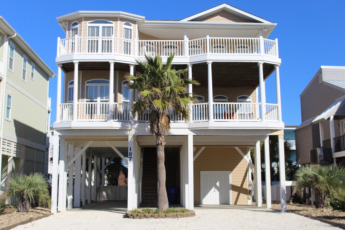 Magandang dekorasyon na beach na may temang OSW1 complex top floor keyless entry 3 bdrm, 2 bath oceanfront condo na may mga malalawak na tanawin ng dagat. Pinapalakas ng unit na ito ang kusinang may kumpletong kagamitan, mga nakahandang higaan na may lahat ng linen at dalawang paliguan na may mga tuwalya kada bisita. Available ang mga bagong muwebles, dalawang malalaking TV na naka - mount sa pader, mga upuan sa beach, payong, at mga tuwalya sa beach para sa iyong kaginhawaan. Mga lingguhang paupahan mula Sabado hanggang Sabado sa panahon. Bawal ang mga golf cart o trailer. Bawal ang mga alagang hayop.