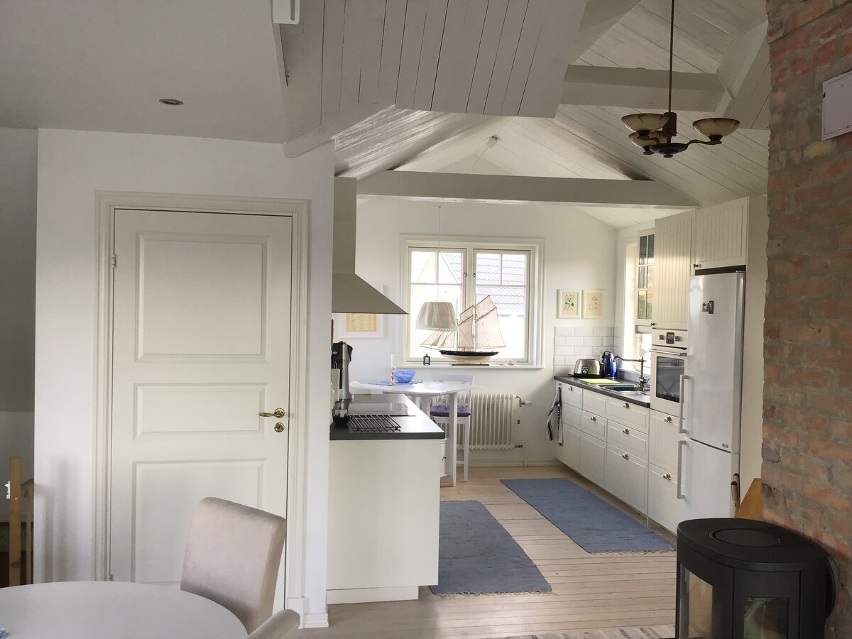 Summer idyll! A pleasant and invitning apartment on the first floor with a private entrance. The apartment has a generous balcony from where you can reach the garden. In the pleasant garden with secluded hedge you will have access to garden furnitures and a grill. You have the possibility to use 2 kayaks. The apartment also has 6 bicycles - free to use. The accommodation is located about 150 m from bathing. You will love our place because of the vicinity to the sea, the bathing and the cliffs.