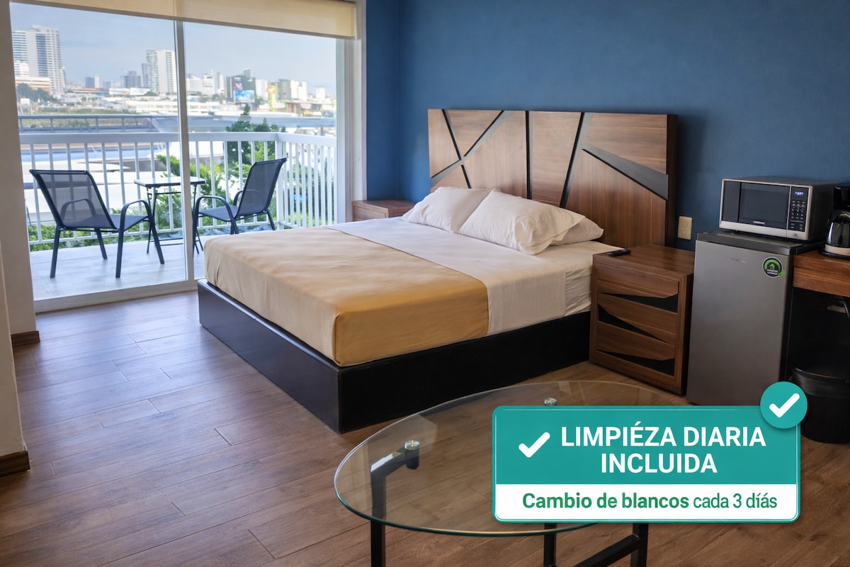 Luxury loft na may terrace sa Sonata Towers, Lomas de Angelópolis. Nagtatampok ng kuwartong may double bed, plush closet, TV, at full bathroom na may mga premium fixture. Kasama sa sala ang sofa, dining area na may microwave, frigobar, coffee station, at desk. Masiyahan sa saklaw na paradahan, serbisyo ng valet, at serbisyo sa kuwarto mula sa in - building restaurant. Mga hakbang mula sa masiglang Sonata District - shop, kainan, at mga aktibidad sa kultura. Mainam para sa negosyo o paglilibang, na may 24 na oras na seguridad para sa ligtas na pamamalagi.
