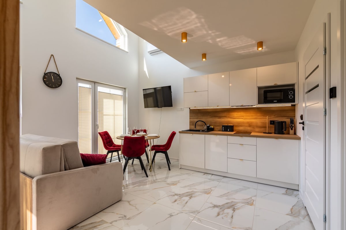 One - level apartment (100 m2) na matatagpuan sa kahoy na bahay sa taas na 1050 sa ibabaw ng dagat!!! Hiwalay ang pasukan. Ang apartment ay may malaking terrace, nagbibigay kami ng mga deckchair. Ang tanawin ng mga bundok ay "pumapasok" sa sala:) Maaari mong iparada ang iyong kotse sa property. Libre ang sauna at fireplace, dagdag na bayad ang 2x jacuzzi ( wood hot tub). Puwede kang pumunta sa Gubałówka nang naglalakad(1 oras) at dumaan sa ropeway papuntang Krupówki (4 na minuto). Mga paligid: mga ruta ng hiking at pagbibisikleta, mga ski slope!