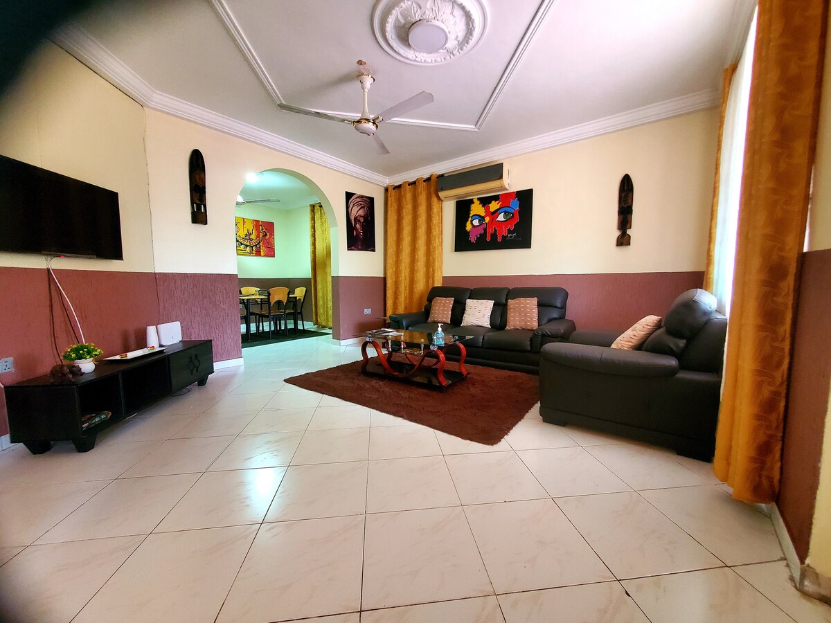 Panatilihin itong simple sa tahimik at sentral na lugar na ito sa kalsada ng Spintex. Mga 15 minutong biyahe lang mula sa paliparan at Tema. Matatagpuan ito sa gitna at malapit ito sa mga shopping center at night life center. May standby generator sa mga kaso ng pagkawala ng kuryente. Mayroon ding libreng Netflix. May access din ang mga bisita sa pool table para sa kanilang libangan. May tagalinis at may 24/7 na seguridad sa tuluyan.