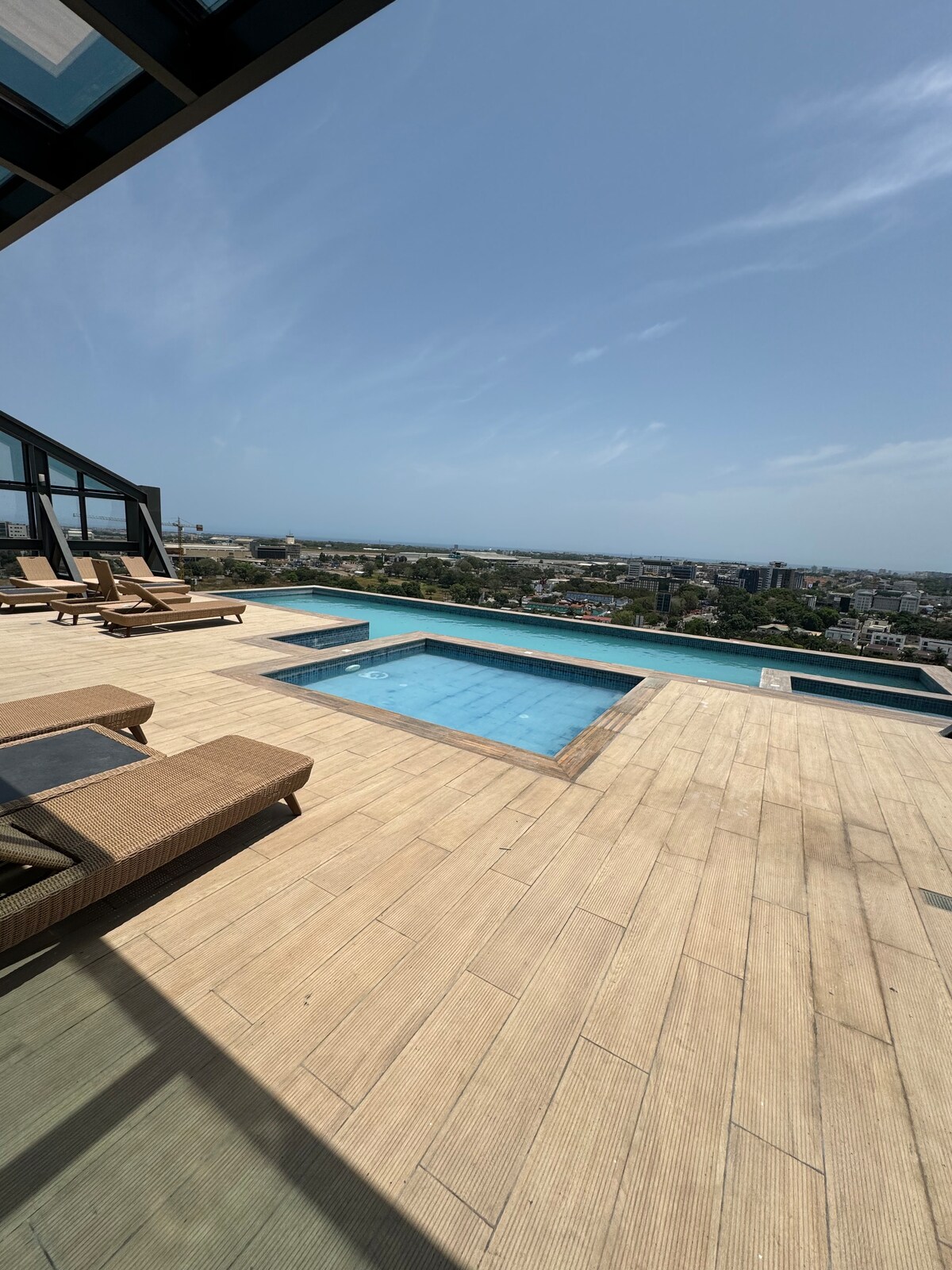 Matatagpuan ang apartment na ito sa Kass Towers, na kasalukuyang pinaka - moderno at marangyang gusali sa Accra. Sa magandang tanawin ng runway ng paliparan, ang studio apartment na ito na may kumpletong kagamitan ay talagang isa sa mga pinakamahusay na iniaalok ng Accra. Kasama sa apartment ang komportableng double bed na may kumpletong kusina, balkonahe na may panlabas na kainan at sofa bed. Ang gusaling ito ay mayroon ding maraming amenidad tulad ng rooftop swimming pool, supermarket, conference room, mini golf at yoga studio.
