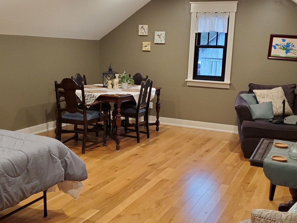 What was originally a hay loft has been converted into a country chic barn apartment. We would love to host you and your friends and family (including actual kids and fur kids) on our property. Children love collecting eggs from the chicken coop and everyone loves a short hike to the creek. We are only an hour from Mammoth Cave National Park and an hour from Holiday World in Santa Claus Indiana. The local community has charming little shops, several restaurants, and The Beaver Dam amphitheater.