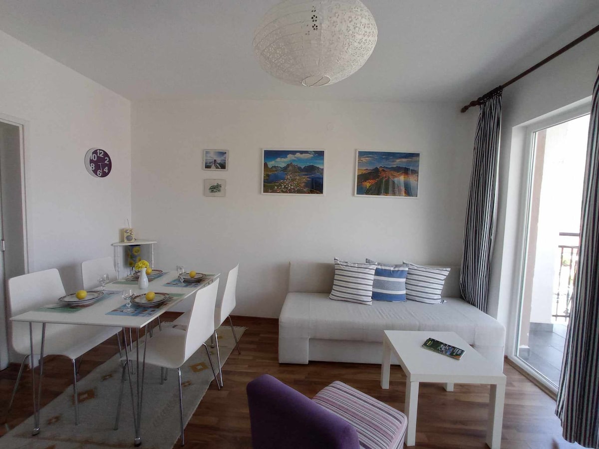 Brand new, luxury apartment 1.6 km mula sa sentro ng lungsod. 10 minutong lakad papunta sa sikat na Ohrid Lake. Malapit ang supermarket (3 min na paglalakad). Hilera ng mga restawran sa malapit. (hal. "Biljanini Izvori," "Stazione Pizzeria," atbp.). Para sa transportasyon, malapit din ito sa hintuan ng bus na may mga linya na kumokonekta sa lahat ng beach sa bayan. Panghuli, ang apartment ay kumpleto sa kagamitan. May kasama itong full kitchen. Mag - set up para sa perpektong get away. Isang bahay na malayo sa bahay.
