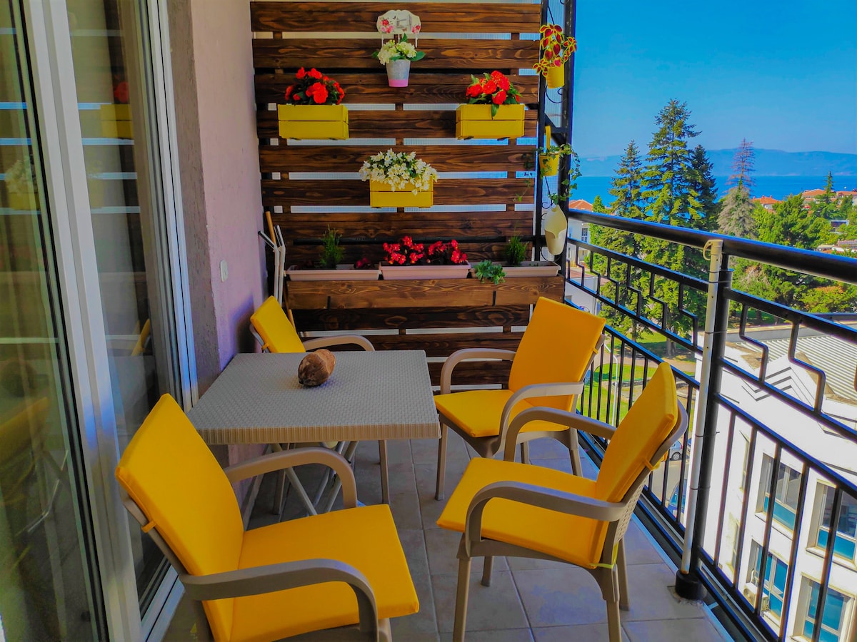 Perpektong Lokasyon. Magandang Tanawin. Kasama ang LIBRENG paradahan sa presyo. Ito ay isang bagong kamangha - manghang dinisenyo apartment. Sa ika -6 na palapag, mayroon itong kamangha - manghang tanawin ng Lake Ohrid, Old Town, at paglubog ng araw. Ang paglalagay sa gitna ng Ohrid sa paligid namin ay karaniwang lahat tulad ng inilarawan namin sa aming "kapitbahayan" na seksyon. Humigit - kumulang 100m ang Lake Ohrid at 10 minutong lakad ang pinakamalapit na beach ng lungsod. Ang central bus station ay matatagpuan sa loob ng 10 minutong biyahe at ang Ohrid International Airport ay mapupuntahan sa loob ng 15 minuto sa pamamagitan ng kotse.