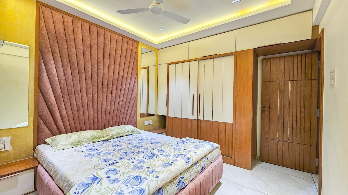 Drift into deep rest in a cozy bedroom that blends modern textures with soft lighting. Featuring a luxurious queen-sized bed with an upholstered headboard, a sleek full-length mirror, ambient pendant lights, and a serene circular wall niche, the space invites you to unplug and truly unwind. Whether you're reading under the warm glow of the pendant lights or waking up to a sunlit room, comfort meets aesthetics in every detail. The in-room AC and fan ensure a pleasant stay through all seasons.