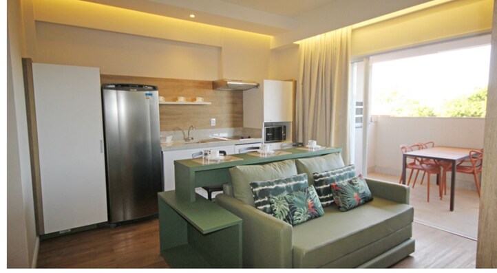 Flat sa tabi ng Thermas dos Laranjais sa Olympia na may kusina Buksan ang konsepto ng kuwarto at silid - tulugan na American kitchen na may double bed, single bed, auxiliary bed at sofa bed sa sala. mainam para sa buong pamilya, serbisyo sa hotel, pinainit na pool, mga naka - air condition na pool at malamig na pool na may wet bar. mga sauna, parke ng tubig, games room,playroom, mini golf, multi - sports court, circus beach tennis court restaurant, bar ,monitor, ilipat sa thermas