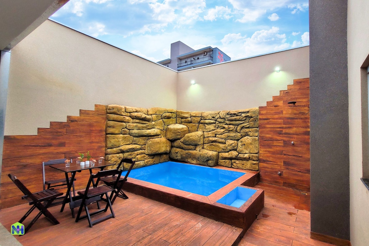 Viva momentos inesquecíveis Piscina aquecida eletronicamente com bar molhado . PET play somente porte pequeno Pet até 8kg. Churrasqueira podendo ser alugada a parte . A piscina é compartilhada , O Flat é individividual Gramado amplo . Estacionamento Tvs de Led WiFi Cozinha com Microondas , cook top,geladeira ,cafeteira , talheres , e utensílios . 1 cama de casal ( 2 adultos ) 1 bicama ( 1 adulto e 1 Criança ) 1 sofá cama ( 2 crianças ) Ar condicionado Andar superior possui escada