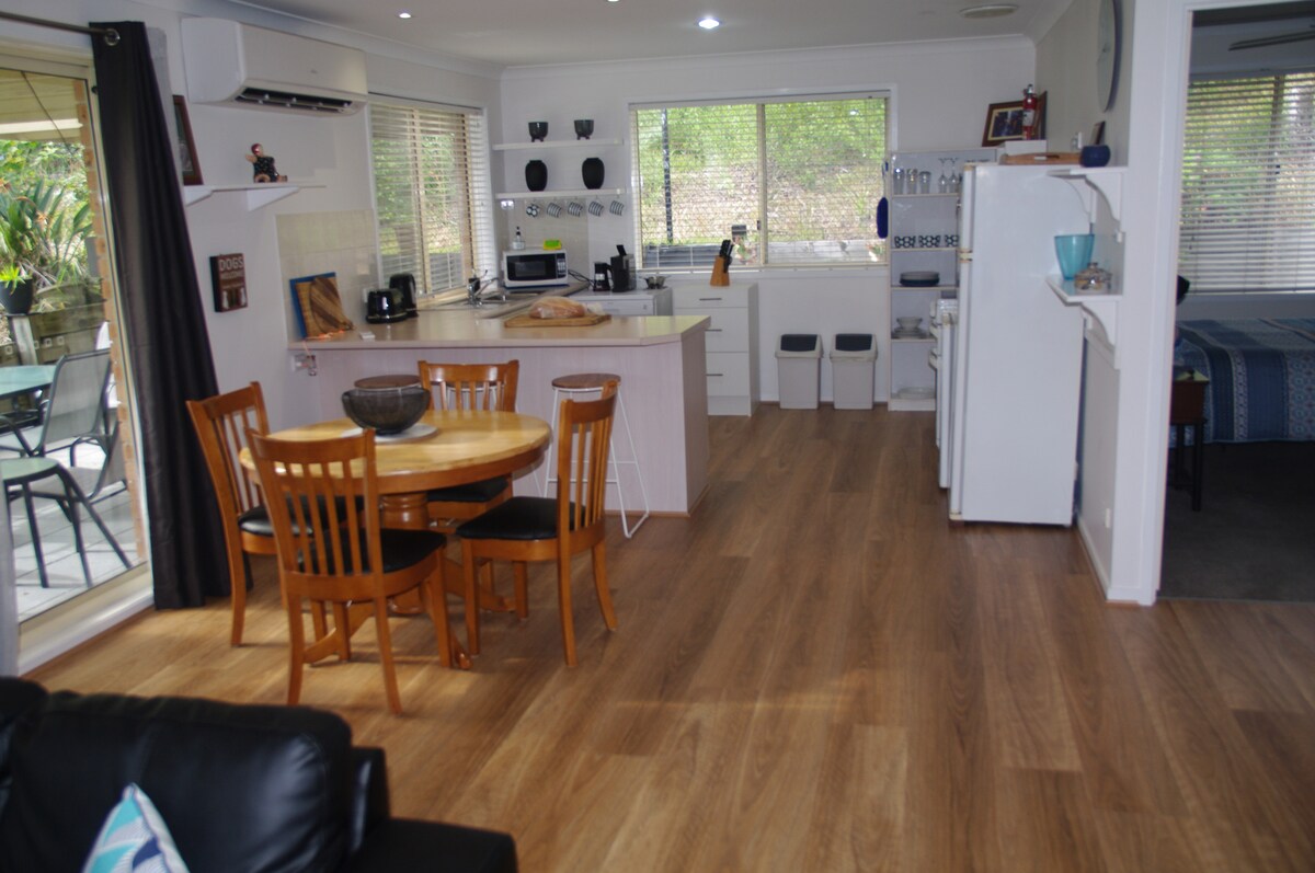 Ang tuluyan ay isang solong antas na tirahan na may bukas na planong kusina at sala. 2 malaking Queen bedroom at 3 - way na banyo. Bumalik sa bushland ang magandang sukat na aspalto at damong - damong lugar sa labas. Ang bakasyon ay isang kanlungan dahil sa pagiging komportable, katahimikan, privacy at lokasyon nito. Nababagay sa 4 na may sapat na gulang. Mga asong "maliit" lang na sinanay sa bahay ang pinapayagan na may sariling sapin sa higaan. Hindi - mga aso sa mga higaan o lounge. Hindi - iniwan ang mga aso sa loob nang walang bantay. Hindi - mga aso na dapat iwanang mag - isa sa loob nang walang bantay. Hindi - pinapahintulutan ang mga de - kuryenteng scooter!!