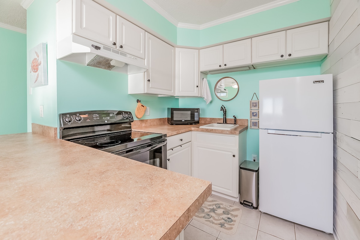 Studio just a 3min walk to the beach and the sound! Professionally decorated to welcome you to the Topsail lifestyle. Perfect for a couple or a getaway for just you. Open living area with a casual contemporary sofa, featuring a full kitchen with high-end appliances. Bistro dining area to enjoy the local fare. Queen bed comfort for sweet dreams! Beautiful bath with large walk-in shower and custom vanity. Bring as many clothes as you like, the closet is Fabulous. Smart TV with WIFI.