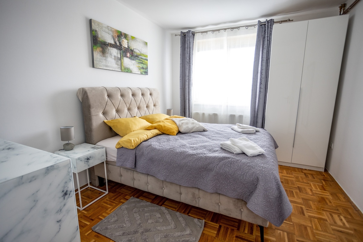 Mamahinga sa modernong apartment na ito sa sentro ng Osijek, na matatagpuan sa isang bagong itinatayo na gusali. Ang apartment ay may marangyang kagamitan at may 4 na bituin. Matatagpuan ito sa mas malawak na sentro ng Osijek, ang sentro (liwasan) ay humigit - kumulang 700m ang layo sa paglalakad. Ang apartment ay may sariling pribadong paradahan, na pinaghihiwalay ng isang rampa at matatagpuan sa likod ng gusali. Nagbibigay ang balkonahe ng tanawin sa concathedral. - May - ari ng Ligtas na pamamalagi sa Croatia label! - Super mabilis na wireless internet na ibinigay!