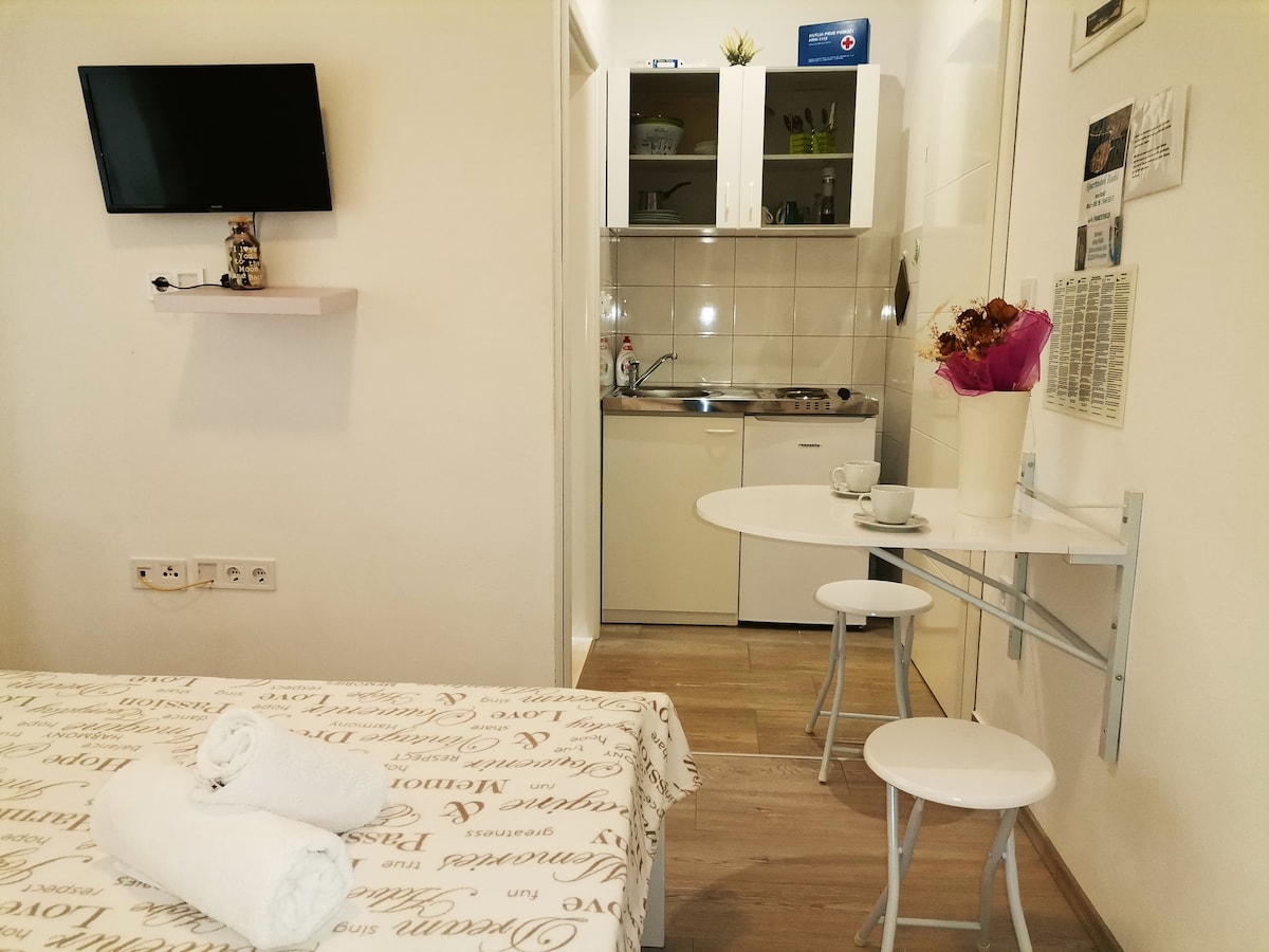 Studio apartment na may lamang 2 metro upang maabot ang beach at dagat, 1st row na walang kalsada infront ng bahay. Isang silid - tulugan, double bed at sofa sa sala na puwedeng gawing higaan. Tamang - tama para sa dalawang tao at isa. May kasamang kusina, banyo, shower na may mainit na watter, libreng wi - fi at libreng paradahan.