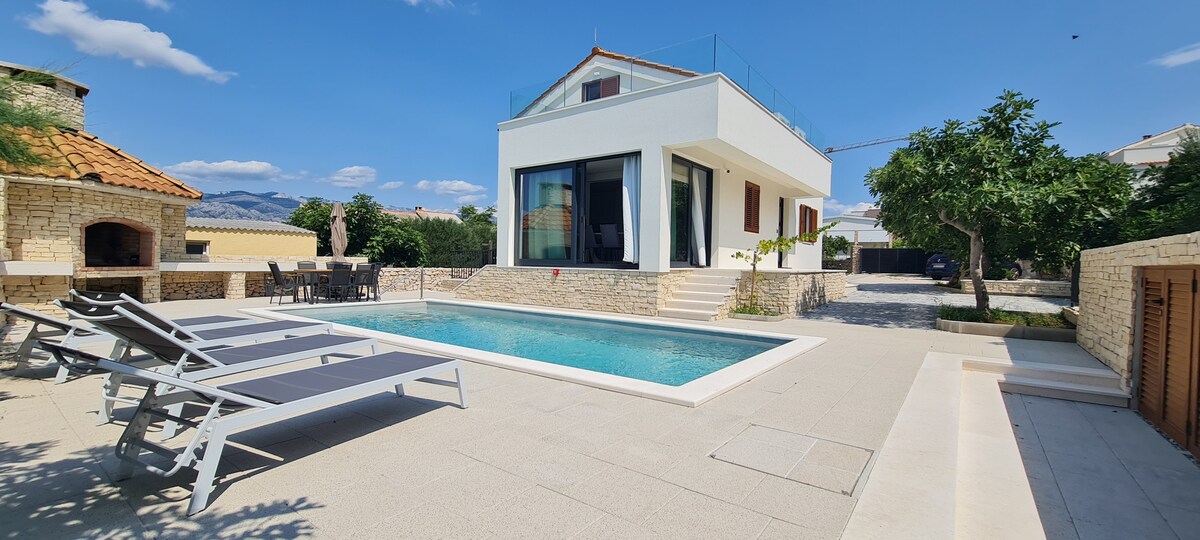 Lass Dich und deine ganze Familie von dieser modernen Luxusvilla mit einem atemberaubenden Blick aufs Meer verzaubern! Sie verfügt über einen 7x3m großen beheizten Pool, eine große Terrasse, eine charmante Grillhütte mit Bar-Theke, und eine Feuerstelle. Die Villa ist 17 km von der historischen Stadt Zadar entfernt. Sie entfaltet sich auf zwei Etagen: oben 4 komfortable Schlafzimmer, unten ein gemütlicher Wohnraum mit moderner Küche. Klimatisierte Räume, ruhige Umgebung, Nähe zum Sandstrand.