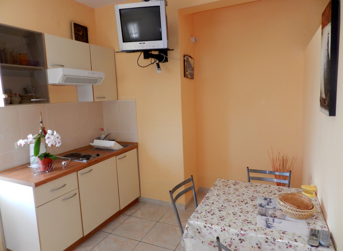 Beachfront apartment na may pribadong beach, 2 malalaking terrace na nag - aalok ng mga nakamamanghang tanawin ng Adriatic Sea. Napapalibutan ng mga pine tree at hardin. Laki: 40 sq. meters, tumatanggap ng 4+1 tao. 2 silid - tulugan: 1 na may 2 pang - isahang kama, 1 na may double bed. Kusinang kumpleto sa kagamitan na may kalan, microwave, refrigerator, mga kagamitan. Living room na may pull - out sofa, coffee table, TV. Silid - kainan. Banyo na may shower, toilet, washbasin. May kasamang pribadong parking space.